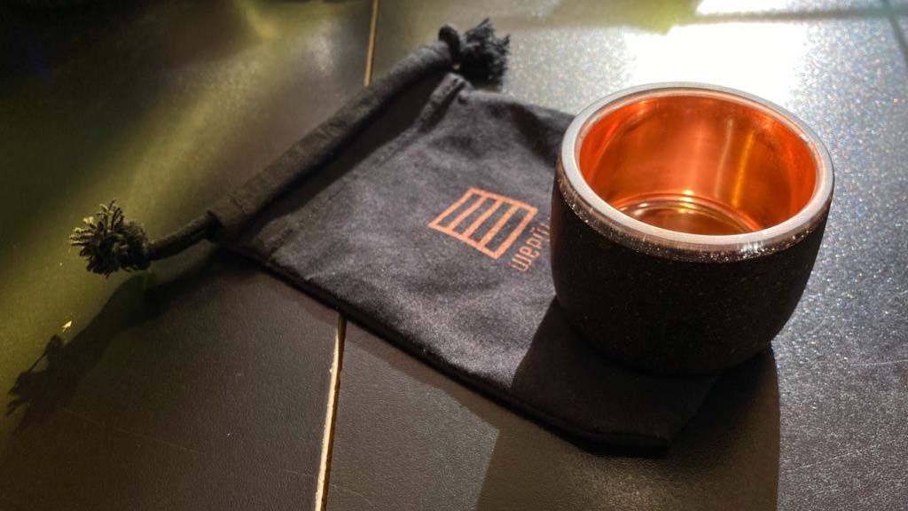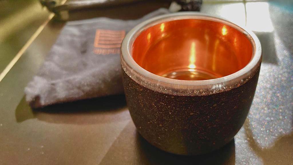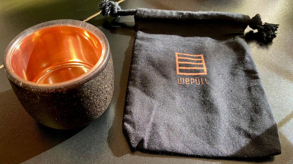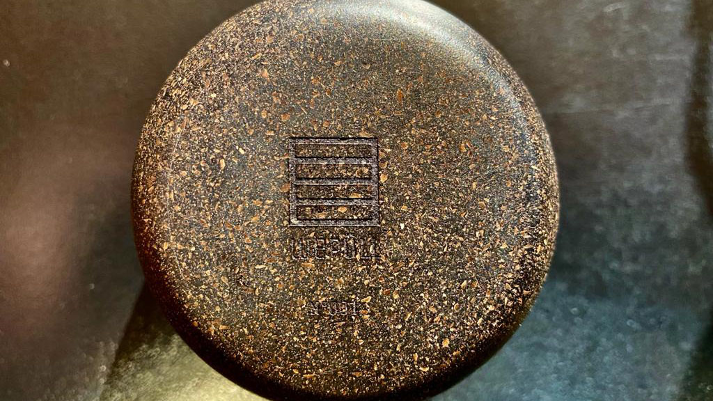 Esta muestra en particular corresponde a un recipiente para café y otros líquidos, con un hermoso interior de cobre que en su conjunto evocan los fuegos volcánicos y minerales de las altas cumbres de Chile, con una agradable terminación natural y texturada compuesta del reciclado de granos de café.